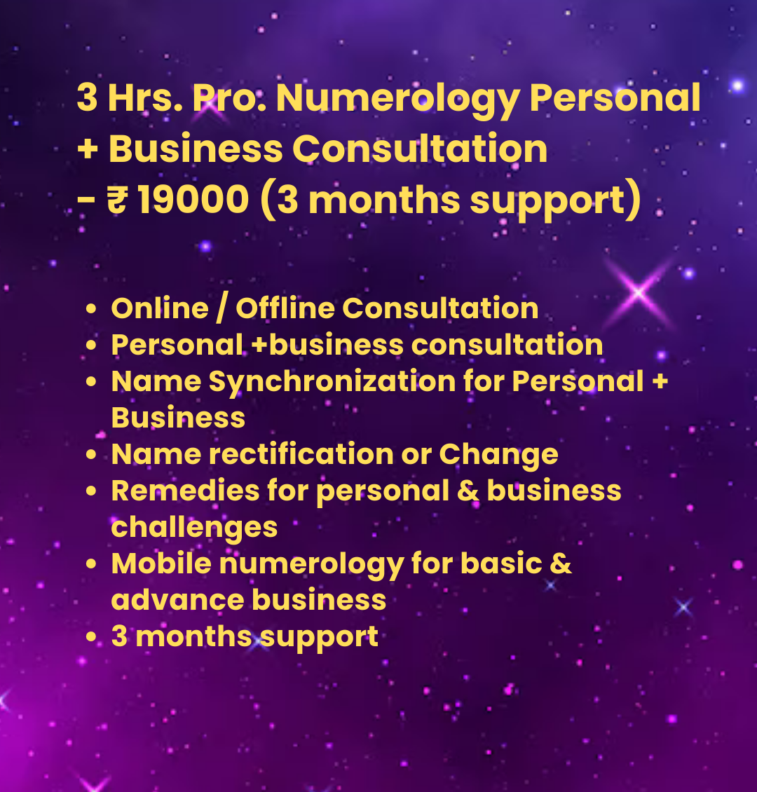 Previous Product Next Product 3 Hrs. Personal + Business Professional Numerology (1 year support) ₹27,000.00 3 Hrs. Personal + Business Professional Numerology (1 year support) quantity Add to cart Category: Uncategorized Related products Quick View Quick View Uncategorized1L Personal + Business Consultation with 1 Logo + Office or shop Vaastu ₹100,000.00 Add to cart Quick View Quick View UncategorizedStudent Consultation under 18 yr. Old with report(45 Min.) ₹5,000.00 Add to cart Quick View Quick View UncategorizedPersonal + Business Consultation with 1 Logo ₹60,000.00 Add to cart