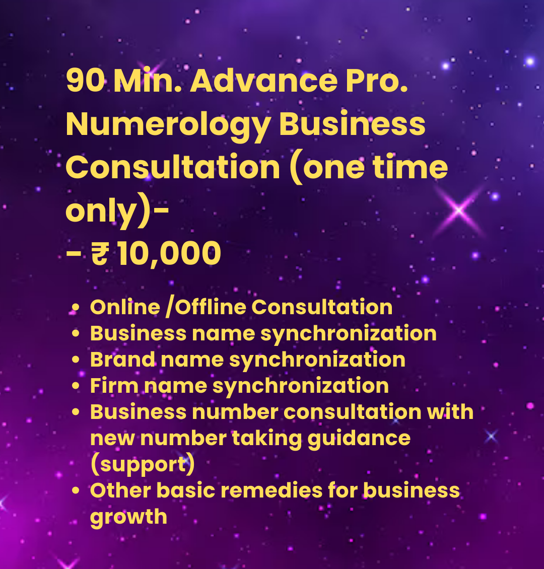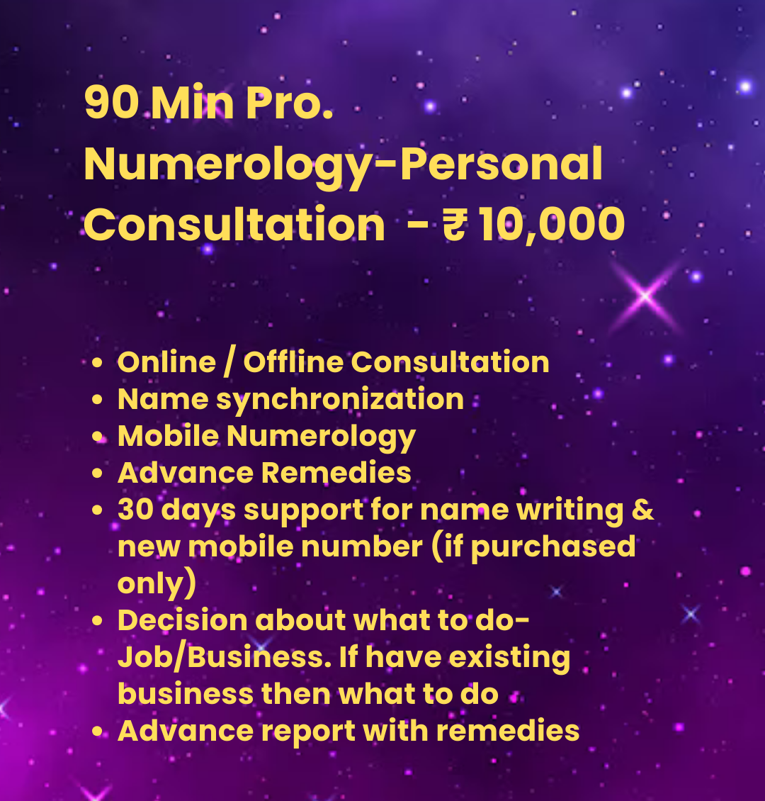 Previous Product Next Product 90 Min Pro. Numerology-Personal Consultation ₹10,000.00 90 Min Pro. Numerology-Personal Consultation quantity Add to cart Category: Uncategorized Related products Quick View Quick View Uncategorized3 Hrs. Pro. Numerology Personal + Business Consultation (3 months support) ₹19,000.00 Add to cart Quick View Quick View UncategorizedAnnual business Consultation type “A” ₹1,000,000.00 Add to cart Quick View Quick View Uncategorized3 Hrs. Pro. Numerology Personal Consultation(1 Year support) ₹19,000.00 Add to cart